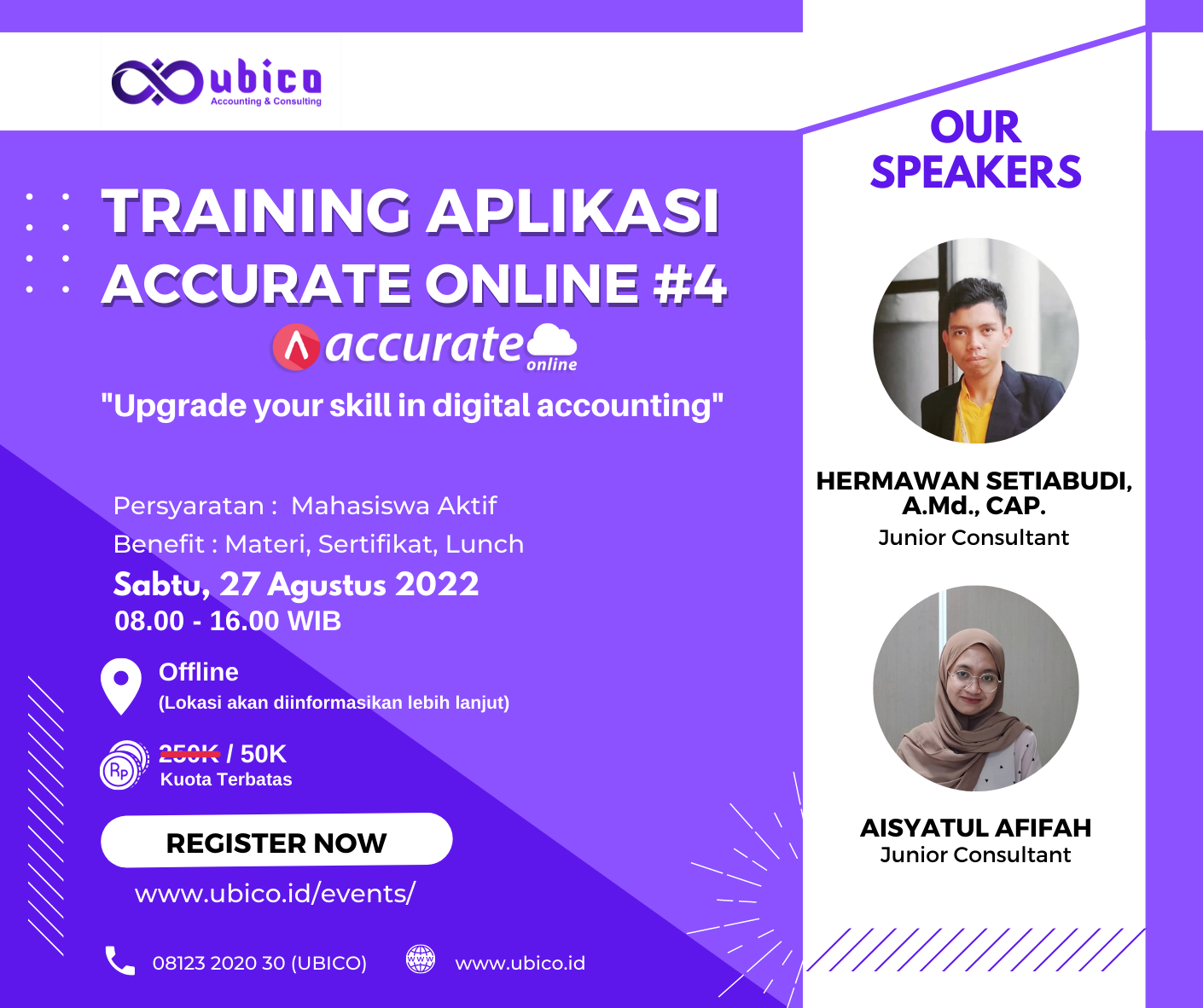 Dalam hal ini UBICO Accounting & Consulting bertujuan untuk meningkatkan skill para mahasiswa di bidang digital accounting melalui training aplikasi “Accurate Online.” Diharapkan menjadi nilai tambah bagi mahasiswa ketika terjun ke dunia kerja sebagai akuntan di sebuah perusahaan.